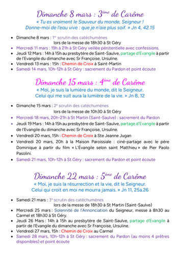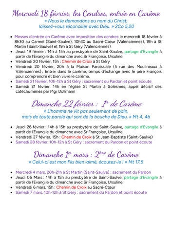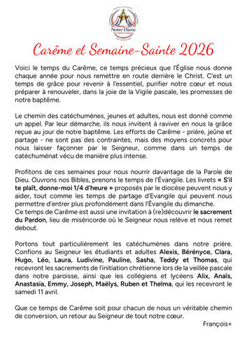 Voici le temps du Carême, ce temps précieux que l’Église nous donne chaque année pour nous remettre en route derrière le Christ. C’est un temps de grâce pour revenir à l’essentiel, purifier notre cœur et nous préparer à renouveler, dans la joie de la Vigile pascale, les promesses de notre baptême.